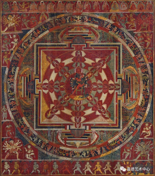 作品描述 此幅胜乐金刚坛城唐卡,主体部分整体呈外圆 内方的结构形式,由内向外又可分为四个部分,也可称为四重结构,即中央圆形的大乐轮、三昧耶轮、城楼与城墙、最外圈的护法墙,各部分绘画的尊像与内容皆不相同,宗教寓意与功用亦互有差异。其中第一重圆形的大乐轮中央绘主尊三面十二臂胜乐金刚双身像,另有多尊二臂双身胜乐金刚像围绕主尊向八个方向呈放射状排列;唐卡上下沿依照早期棋格式构图,按神格高低自左上而下依次描绘胜乐金刚教法传承师众、眷属及护法,等级森严,布局严密。唐卡颜料选用天然矿物彩绘制,依照早期尼泊尔绘画传统使用绛红作为画面主色调,配色古朴大气,品相完好,兼具艺术性与宗教性。 展开>